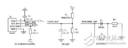 ,微處理器應(yīng)驅(qū)動(dòng)DATA在低電平。需要一個(gè)外部的上拉電阻將信號(hào)提拉至高電平,圖3顯示CC2430的引腳P1.2用于SCK,P1.3用于DATA.圖3 三種傳感器連接原理圖光照度傳感器PGM5506實(shí)際