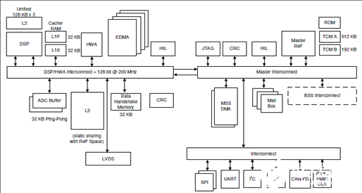 – 1.75 MB, divided into MSS program RAM (512KB), MSS data RAM (192 KB), DSP L1 RAM(64KB) and L2 RAM (256 KB), and L3 radardata cube RAM (768 KB)