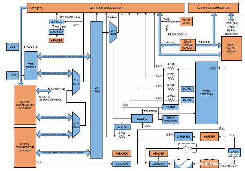 ? 60-pin, high-density (HD) connector for raw analog-to-digital converter (ADC) data over LVDS andtrace data capability