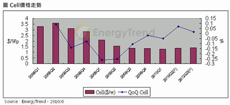 觀察第二季現(xiàn)貨市場(chǎng)價(jià)格的走勢(shì),4月到6月的報(bào)價(jià)持續(xù)上漲,4月、5月的平均漲幅接近4%,而6月價(jià)格的平均漲幅則下滑到1.5%左右。EnergyTrend估計(jì),第二季的平均價(jià)格為1.41美元/Wp,較首季上漲8.7%。而對(duì)于第三季的報(bào)價(jià)狀況,EnergyTrend認(rèn)為受到歐洲經(jīng)濟(jì)狀況的影響,使目前第三季的報(bào)價(jià)維持與6月相同,平均價(jià)格則是小漲1.7%。