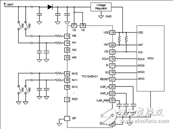 電容,24個(gè)二極管和2個(gè)外部晶體管。相較之下,TI的TIC12400-Q1多開關(guān)檢測(cè)接口(MSDI)僅使用24個(gè)IO引腳電容、5個(gè)去耦電容、用于中斷輸出的單個(gè)電阻以及單個(gè)的MSDI設(shè)備。圖3一對(duì)一