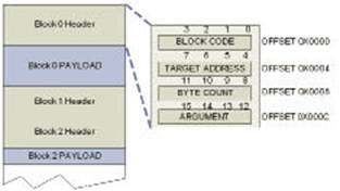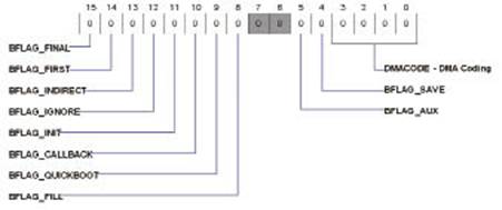 頭部的標(biāo)志符共有16比特,如圖4所示。這里需要著重指出的是BFLAG_FINAL、BFLAG_FIRST、BFLAG_INIT和BFLAG_FILL四個標(biāo)志符,它們分別指出當(dāng)前的子塊為結(jié)束塊、開始塊、初始化塊和填充塊。一般情況下每個LDR文件都會存在這四個標(biāo)志符,而且具有其中任何一個標(biāo)志符的子塊都沒有的負載區(qū)。一旦啟動碼流解析到標(biāo)志符中有BFLAG_FINAL或BFLAG_INIT,它會馬上調(diào)用入口地址存儲在EVT1寄存器中的函數(shù),這個地址通常是0xFFA0 0000。也就是說,在默認的情況下,應(yīng)用程序的起始位置和初始化函數(shù)的起始地址都是0xFFA0 0000。DMACODE用來配置DMA通道的寬度和傳輸步長,但一般只在啟動開始的時候設(shè)置一次。