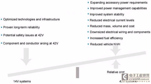 圖1:42V系統(tǒng)和12V系統(tǒng)各自的優(yōu)勢(shì)比較。