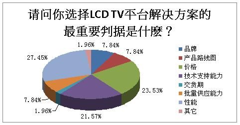 這一結(jié)果顯示,中國(guó)客戶在選擇LCD TV平臺(tái)時(shí)已不再迷信品牌,品牌影響力已變得不再像以前那么重要,采購(gòu)經(jīng)理和項(xiàng)目經(jīng)理最看重的因素是平臺(tái)的性能,這預(yù)示著目前LCD TV制造商的市場(chǎng)策略主要還是以提高產(chǎn)品性能的差異化來獲得更大的利潤(rùn),供應(yīng)價(jià)格不是最關(guān)鍵的采購(gòu)決策依據(jù),因?yàn)樗谀壳爸袊?guó)制造商的策略中還不是創(chuàng)造利潤(rùn)的關(guān)鍵因素,它還僅是一個(gè)次要因素,技術(shù)支持能力之所以重要,是因?yàn)樗荓CD TV制造商趕上目前性能決定利潤(rùn)市場(chǎng)窗口期的必要保證。