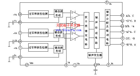 于任意相整流電路等。該芯片還可選擇鋸齒波線性輸出或余弦函數(shù)輸出兩種方式,當(dāng)采用余弦函數(shù)輸出時(shí),它的整流輸出電壓與控制電壓成線形關(guān)系。該芯片既可用于單、三相半控、全控橋可控硅整流觸發(fā)和單、三相交流調(diào)壓