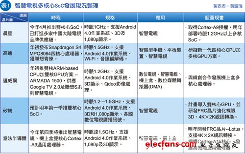 由于智慧電視與行動(dòng)裝置的晶片發(fā)展軌跡愈來(lái)愈相近,因而也吸引應(yīng)用處理器商前來(lái)?yè)尫直?/p>