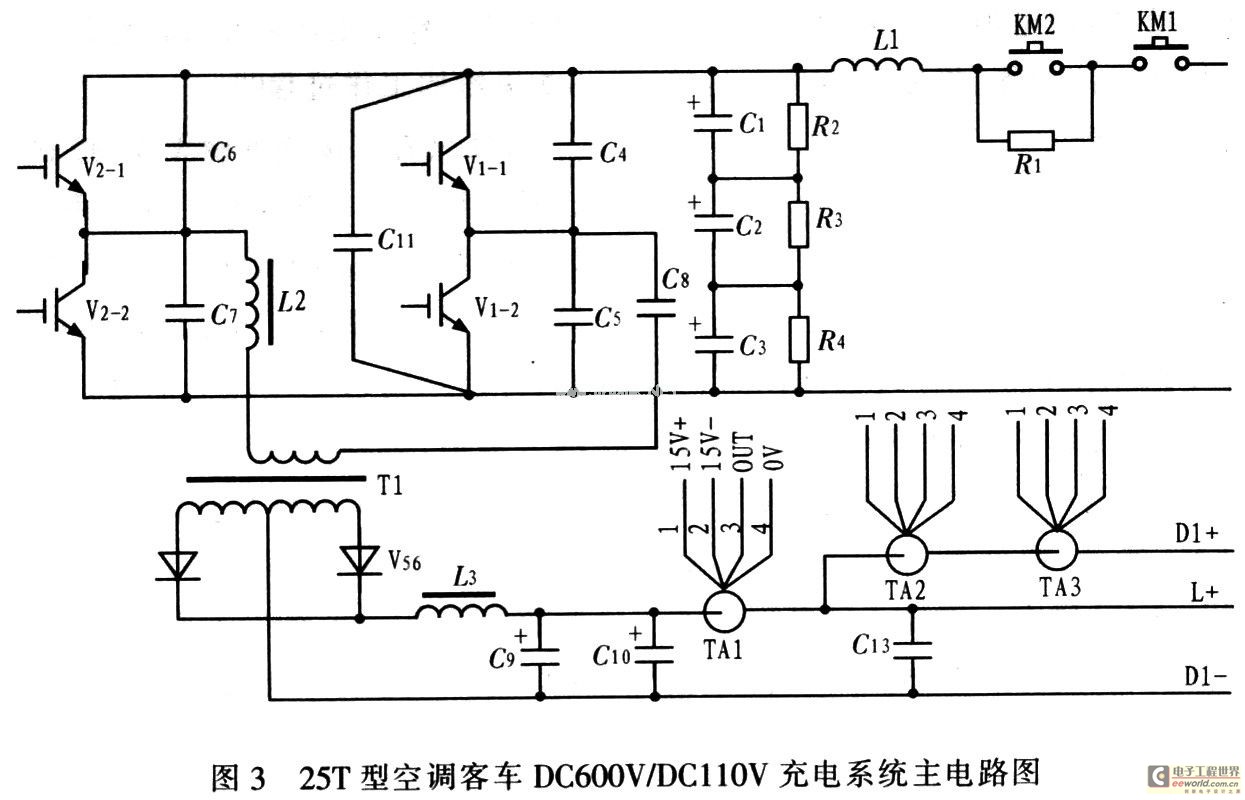 101 分析25T型空調(diào)客車DC600V/DC110V8kW充電系統(tǒng)的組成,重點研究充電系統(tǒng)的PWM高頻橋式整流電路和DC/DC電壓變換電路的特點、實現(xiàn)方法和保護(hù),闡述充電系統(tǒng)、保護(hù)系統(tǒng)的工作過程,分析