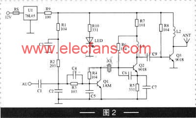 1856 收音機(jī)接收播放。最大的方便是不需要對(duì)汽車原有音響電路進(jìn)行任何改動(dòng)。MP3轉(zhuǎn)發(fā)器電路如圖1所示,電路中采用了調(diào)頻立體聲發(fā)射器專用集成電路BA1404(IC1),電路簡(jiǎn)潔、外圍元器件少、音質(zhì)好、立體聲分離度高