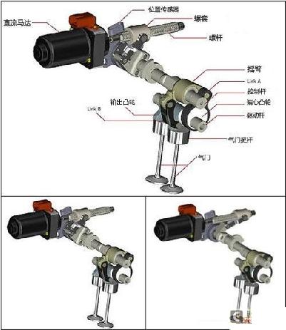 ????具體實(shí)現(xiàn)方法也很簡單,在此我們不得不佩服這些工程師的奇思妙想。首先車載電腦根據(jù)當(dāng)前的發(fā)動機(jī)轉(zhuǎn)速來決定螺套的所在位置,那個(gè)黑色的直流馬達(dá)就是用來驅(qū)動螺套的。而螺套由一根連桿與控制桿相連,螺套的橫向移動可以帶動控制桿轉(zhuǎn)動,控制桿轉(zhuǎn)動時(shí)上面的搖臂隨之轉(zhuǎn)動,而搖臂又與link B(連桿B)相連,搖臂逆時(shí)針轉(zhuǎn)動時(shí)就會帶動link B去頂氣門挺桿上端的輸出凸輪,最后輸出凸輪就會頂起氣門來改變氣門升程。如果沒看明白請把本段結(jié)合上面兩張圖再看一遍,應(yīng)該不難理解。