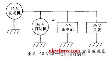 42V電氣系統(tǒng)的單一電壓方案如圖2所示,42V單一電壓會對目前的汽車零配件制造商造成大沖擊,因此推廣有一定困難。