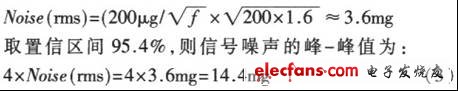 傾斜角度測量值通過XOUT、YOUT端口輸出的數(shù)字信號得到。由于經(jīng)XFILT、YFILT端口的電容低通濾波,信號帶寬為200Hz.則根據(jù)ADXl202的噪聲計(jì)算公式為: