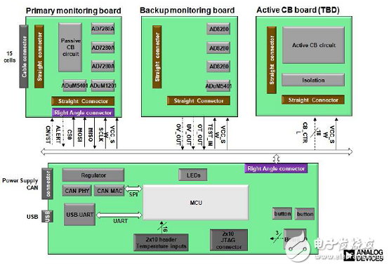 ADI公司的15通道鋰電池管理模塊主要采用AD7280A,AD8280,ADuM5401,ADuM1201, ADuC7026和AD8601,實(shí)現(xiàn)了對(duì)15個(gè)鋰電池單體的電壓和溫度監(jiān)測(cè),在保證信號(hào)監(jiān)測(cè)精度的同時(shí),提供了主監(jiān)測(cè)電路和次級(jí)監(jiān)測(cè)電路的架構(gòu),實(shí)現(xiàn)更高級(jí)別的系統(tǒng)保護(hù)。還提供了模塊化可擴(kuò)展的板級(jí)架構(gòu),除主監(jiān)測(cè)電路模塊,次級(jí)監(jiān)測(cè)電路模塊,數(shù)據(jù)接口模塊外,可擴(kuò)展主動(dòng)均衡電路等其他模塊,方便系統(tǒng)原型開(kāi)發(fā)。本文介紹了AD7280A1主要特性,框圖和應(yīng)用電路,以及15通道鋰電池管理模塊BMU基本功能,框圖,電路圖,材料清單和PCB元件布局圖和設(shè)計(jì)圖。