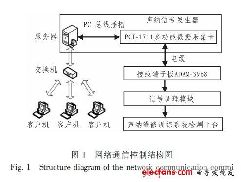 文中針對某型聲納維修訓(xùn)練系統(tǒng)的通信需求,結(jié)合聲納信號發(fā)生器的特點,提出了基于C/S模式的通信控制模塊設(shè)計方案。模塊采用Winsock網(wǎng)絡(luò)編程技術(shù)實現(xiàn)了客戶機與服務(wù)器間高速局域網(wǎng)通信,服務(wù)器響應(yīng)客戶機的請求后,輸出數(shù)字控制量并利用PCI-1711的12位D/A轉(zhuǎn)換功能,將數(shù)字控制量轉(zhuǎn)換為模擬信號,從而實現(xiàn)聲納信號發(fā)生器任意波形產(chǎn)生。該信號發(fā)生器輸出信號的幅度、頻率、脈寬、持續(xù)時間等參數(shù)均可通過網(wǎng)絡(luò)通信方式設(shè)置,并易于調(diào)節(jié)。本系統(tǒng)控制靈活,具有較高的實用價值。