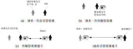 當(dāng)撥號成功,對方拎起話筒,傳輸連接就建立起來了,如圖(c)。然后,你接過電話,此時會話層(連接)建立成功,如圖(d)。