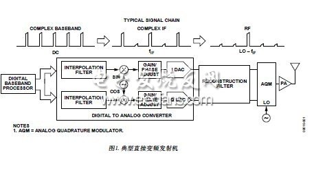 直接復(fù)調(diào)制逐漸成為在蜂窩基站、WiMAX、無線點(diǎn)對點(diǎn)等終端應(yīng)用中部署發(fā)射器信號鏈的首選架構(gòu)。這種技術(shù)直接將數(shù)模轉(zhuǎn)換器的輸出IQ信號調(diào)制到RF載波上(直接轉(zhuǎn)換),從而擺脫中間IF級和相關(guān)濾波器。圖1顯示典型的直接轉(zhuǎn)換發(fā)射器。