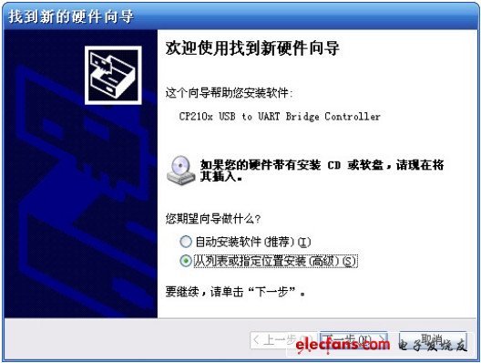 第一步:用隨機(jī) USB 通訊電纜連接儀器的 USB 插座和計(jì)算機(jī) USB口;顯示找到新硬件向?qū)?,選擇“從列表或指定位置安裝(高級(jí))”選項(xiàng),進(jìn)入下一步;