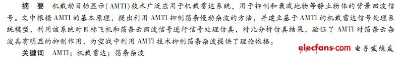 ??? 機(jī)械動(dòng)目標(biāo)顯示(AMTI)技術(shù)廣泛應(yīng)用于機(jī)械雷達(dá)系統(tǒng),用于抑制和衰減地物等靜止物體的背景回?fù)?a target='_blank' class='arckwlink_none'>信號(hào)。文中根據(jù)AMTI的基本原理,提出利用AMTI抑制箔條慢動(dòng)雜波的方法,并建立基于AMTI的機(jī)械雷達(dá)信號(hào)處理系統(tǒng)模型......