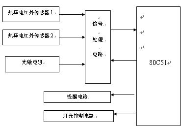 1) 傳感器及信號處理部分:檢測人體輻射紅外信號及光強(qiáng)信號經(jīng)過處理后變成可處理的數(shù)字信號