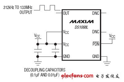 The DS1088L is a low-cost clock generator that producesa square-wave output without external timing components.The fixed-frequency oscillator is available infactory-calibrated frequencies from 312kHz to 133MHz.The device has a power-down pin for power-sensitiveapplications.