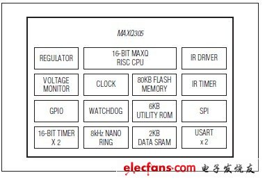 The MAXQ305 is a reduced supply voltage, low-power,16-bit MAXQM microcontroller designed for low-powerapplications including universal remote controls,consumer electronics, and white goods. The MAXQ305combines a powerful 16-bit RISC microcontroller andintegrated peripherals including two USART ports anda SPI master/slave communications port, along with anIR module with carrier frequency generation and flexibleport I/O capable of multiplexed keypad control. TheMAXQ305 includes 80KB of flash program memory and2KB of data SRAM.