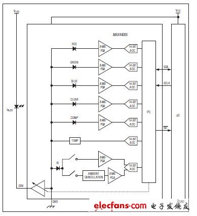 The MAX44005 integrates 7 sensors in one product: red,green, blue (RGB) sensors; an ambient light (clear) sensor;a temperature sensor; an ambient infrared sensor,and an infrared proximity sensor with an I2C interface.This highly integrated optical sensor includes a temperaturesensor to improve reliability and performance.