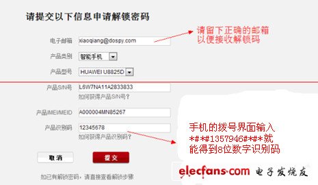 按照提示填寫相關(guān)內(nèi)容,其中產(chǎn)品S/N號(hào)和產(chǎn)品IMEI/MEID這兩項(xiàng)你把自己手機(jī)電池扣下來就能看到。手機(jī)的撥號(hào)界面輸入*#*#1357946#*#*就能得到識(shí)別碼。(這里華為官網(wǎng)的申請(qǐng)頁面也有提示如何獲得S/N、IMEI/MEID碼和識(shí)別碼)