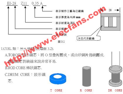 A:鍛燒(黑片)、 N:無鍛燒(白片)兩種.按其形狀不同可分為:EI 型、