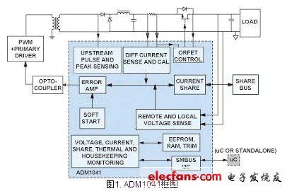ADM1041次級端控制器提供電流檢測、電壓檢測、總線共享和OrFET控制??梢酝ㄟ^SMBUS總線對器件進行設置。