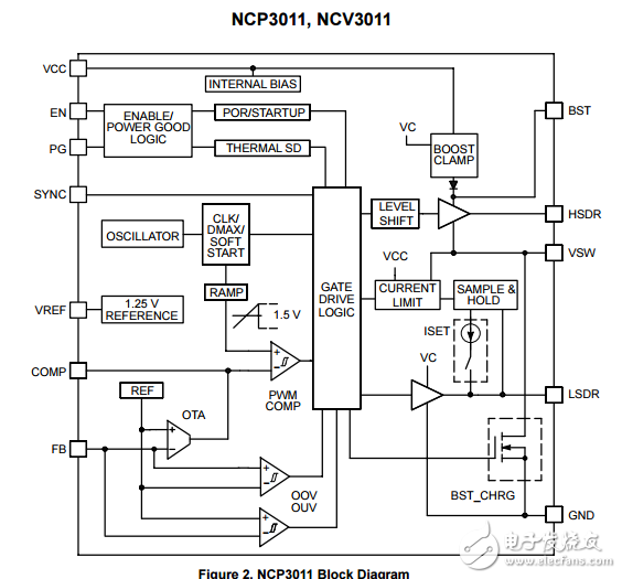 The NCP3011 is a PWM device designed to operate from a wide input range and is capable of producing an output voltage as low as 0.8 V. The NCP3011 provides integrated gate drivers and an internally set 400 kHz oscillator. The NCP3011 has an externally compensated transconductance error amplifier with an internally fixed soft?start. The NCP3011 incorporates output voltage monitoring with a Power Good pin to indicate that the system is in regulation. The dual function SYNC pin synchronizes the device to a higher frequency (Slave Mode) or outputs a 180° out?of?phase clock signal to drive another NCP3011 (Master Mode)。 Protection features include lossless current limit and short circuit protection, output overvoltage and undervoltage protection, and input undervoltage lockout. The NCP3011 is available in a 14?pin TSSOP package.