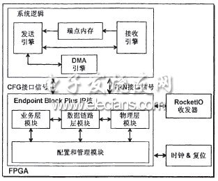系統(tǒng)硬件部分負(fù)責(zé)采集前端高速LVDS數(shù)據(jù)并通過PCI Express總線傳輸給計(jì)算機(jī),以Xilinx公司MLS05開發(fā)板為實(shí)現(xiàn)載體,通過在Virtex-5 FPGA中設(shè)計(jì)邏輯實(shí)現(xiàn)高性能的DMA傳輸。FPGA中邏輯由Endpoint Block Plus IP核和系統(tǒng)邏輯組成。系統(tǒng)邏輯作為系統(tǒng)的核心使用發(fā)送引擎、接收引擎、端點(diǎn)內(nèi)存和DMA引擎四個(gè)主要模塊,完成了TLP的發(fā)送與接收,DMA傳輸?shù)陌l(fā)起與控制、采集信號的存儲等任務(wù)。