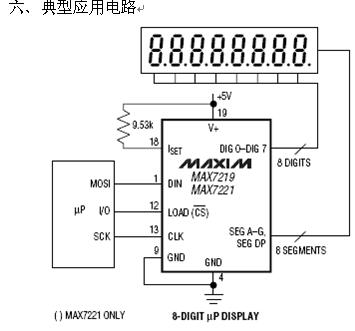 一個(gè)方便的四線串行接口可以聯(lián)接所有通用的微處理器。每個(gè)數(shù)據(jù)可以尋址在更新時(shí)不需要改寫(xiě)所有的顯示。MAX7219/MAX7221同樣允許用戶(hù)對(duì)每一個(gè)數(shù)據(jù)選擇編碼或者不編碼。