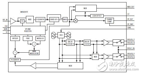 MAX2870為超寬頻帶鎖相環(huán)(PLL), 集成壓控振蕩器(VCO),能夠工作在整數(shù)和分?jǐn)?shù)N分頻模式。配合外部參考時(shí)鐘振蕩器和環(huán)路濾波器,MAX2870可構(gòu)成高性能頻率合成器,產(chǎn)生23.5MHz至6.0GHz頻率范圍的時(shí)鐘,并可保持優(yōu)異的相位噪聲和雜散指標(biāo)。