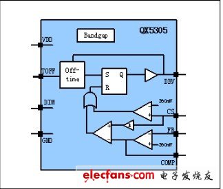 QX5305 是一款高效率,穩(wěn)定可靠的高亮度LED燈驅(qū)動(dòng)控制IC,內(nèi)置高精度比較器,off-time控制電路,恒流驅(qū)動(dòng)控制電路等,特別適合大功率,多個(gè)高亮度LED燈串恒流驅(qū)動(dòng)。 QX5305采用固定off-time控制工作方式,其工作頻率可高達(dá)2.5MHz,可使外部電感和濾波電容、體積減少,效率提高。 在DIM腳加PWM信號(hào),可調(diào)節(jié)LED燈的亮度。 通過(guò)調(diào)節(jié)外置的電阻,能控制高亮度LED燈的驅(qū)動(dòng)電流,使LED燈亮度達(dá)到預(yù)期恒定亮度,流過(guò)高亮度LED燈的電流可從幾毫安到2安培變化。