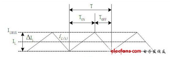 QX5305 采用峰值電流檢測(cè)和固定off-time控制方式。片內(nèi)的R-S觸發(fā)器分別由off-time定時(shí)器置位和CS比較器、FB比較復(fù)位,它控制外部MOSFET管并和功率電感 L、LED、肖特基二極管共同構(gòu)成一個(gè)自振蕩的,連續(xù)電感電流模式的升壓型恒流LED驅(qū)動(dòng)電路(參見圖1)。 除了固定off-time控制這點(diǎn)外,QX5305的工作方式和普通的電流模式PWM控制型DC/DC升壓電路非常相似。當(dāng)工作在連續(xù)電流模式下時(shí),流過(guò)功率電感的電流IL如圖所示: