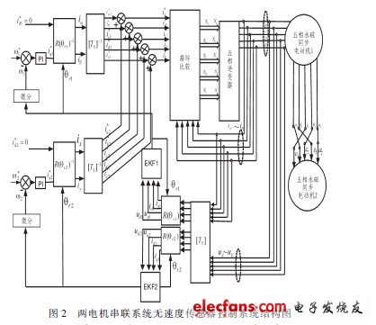 在同一逆變器供電下的兩臺永磁同步電機(jī)(PMSM)串聯(lián)系統(tǒng),可運(yùn)用矢量控制技術(shù)實現(xiàn)獨(dú)立解耦控制。本文提出了一種基于EKF的兩臺五相PMSM串聯(lián)系統(tǒng)的擴(kuò)展Kakman濾波器(EKF)轉(zhuǎn)速估計方法,觀測器狀態(tài)方程采用轉(zhuǎn)子磁鏈定向的同步旋轉(zhuǎn)坐標(biāo)系下的電壓方程。在線實時估計轉(zhuǎn)子的位置和轉(zhuǎn)速,使得電機(jī)能夠在無需知道轉(zhuǎn)子初始位置的情況下啟動和運(yùn)行。通過Matlab/Simulink進(jìn)行了變速仿真分析,仿真結(jié)果驗證了該算法的可行性。