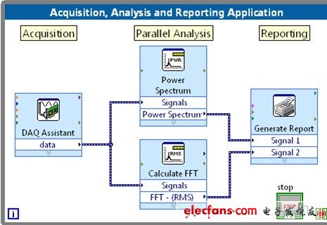 在線分析與報(bào)告是一個(gè)術(shù)語,指在數(shù)據(jù)采集應(yīng)用中集成數(shù)據(jù)處理或者報(bào)表生成功能。當(dāng)您從一個(gè)函數(shù)采集數(shù)據(jù),比如DAQ助手,您可以簡單地把數(shù)據(jù)連線至分析函數(shù)塊,采集的數(shù)據(jù)就會(huì)被分析。