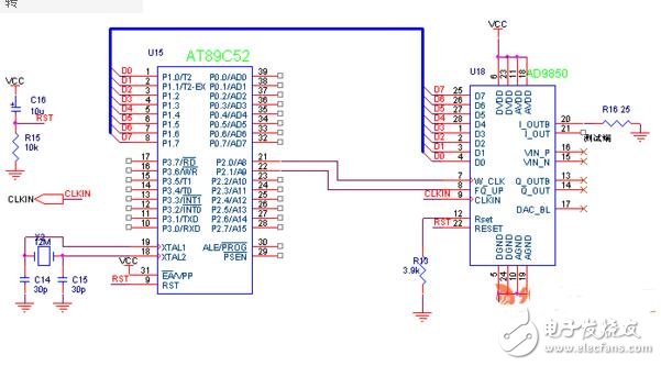 AD9850的復(fù)位(RESET) 信號為高電平有效,且脈沖寬度不小于5 個(gè)參考時(shí)鐘周期。AD9850的參考時(shí)鐘頻率一般遠(yuǎn)高于單片機(jī)的時(shí)鐘頻率(小廝所用為單片機(jī)89C51,使用12M晶振), 因此AD9850 的復(fù)位(RESET)端可與單片機(jī)的復(fù)位端直接相連。