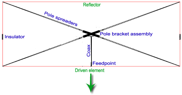 扇形振子即有源振子與饋線相連,尺寸計算和連接方式見扇形振子天線。此天線設計頻寬120兆赫,所以中心頻率為720兆赫。由于是定向天線,調(diào)測時應對準DTMB信號發(fā)射塔所在方向。