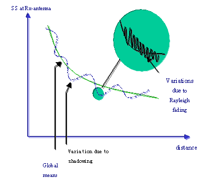 | 移動(dòng)通信的傳播如圖5-02中的曲線(xiàn)所示,總體平均值隨距離減弱,但信號(hào)電平經(jīng)歷快慢衰落的影響。慢衰落是由接受點(diǎn)周?chē)匦蔚匚飳?duì)信號(hào)反射,使得信號(hào)電平在幾十米范圍內(nèi)有大幅度的變化,若移動(dòng)臺(tái)在沒(méi)有任何障礙物的環(huán)境下移動(dòng),則信號(hào)電平只與發(fā)射機(jī)的距離有關(guān)。所以通常某點(diǎn)信號(hào)電平是指幾十米范圍內(nèi)的平均信號(hào)電平。這個(gè)信號(hào)的變化呈正態(tài)分布。標(biāo)準(zhǔn)偏差對(duì)不同地形地物是不一樣的,通常在6-8dB左右??焖ヂ涫钳B加在慢衰落信號(hào)上的。這個(gè)衰落的速度很快,每秒可達(dá)幾十次。除與地形地物有關(guān),還與移動(dòng)臺(tái)的速度和信號(hào)的波長(zhǎng)有關(guān),并且幅度很大,可幾十個(gè)dB,信號(hào)的變化呈瑞利分布??焖ヂ渫鶗?huì)降低話(huà)音質(zhì)量,所以要留快衰落的儲(chǔ)備。 | ![]() 圖5-02 |