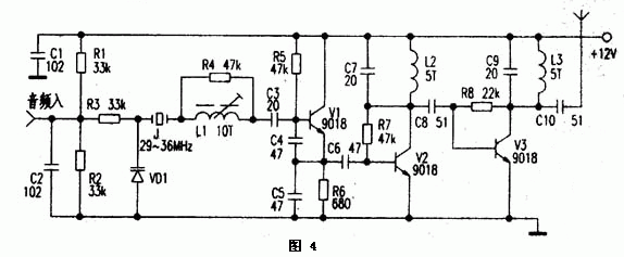 圖4為晶振式發(fā)射機(jī)電路。電路中J.、VD1、L1、C3~C5、V1組成晶體振蕩電路。由于石英晶體J的頻率穩(wěn)定性好,受溫度影響也較小,所以廣泛用于無(wú)繩電話(huà)及AV調(diào)制器中。Vl是29~36MHz晶體振蕩三極管,發(fā)射極輸出含有豐富的諧波成分,經(jīng)V2放大后,在集電極由C7、L2構(gòu)成諧振于88-108MHz的網(wǎng)絡(luò)選出3倍頻信號(hào)(即87~108MHz的信號(hào)最強(qiáng)),再經(jīng)V3放大;L3、C9選頻后得到較理想的調(diào)頻頻段信號(hào)。頻率調(diào)制的過(guò)程是這樣的,音頻電壓的變化引起VD1極間電容的變化;由于VD1與晶體J串聯(lián),晶體的振藩頻率也發(fā)生微小的變化,經(jīng)三倍頻后,頻偏是29-36MHz晶體頻偏的3倍。實(shí)際應(yīng)用時(shí),為獲得合適的調(diào)制度,可選擇調(diào)制頻偏較大的石英晶體或陶瓷振子,也可以采用電路稍復(fù)雜的6-12倍頻電路。若輸入的音頻信號(hào)較弱;可加上一級(jí)電壓放大電路。
