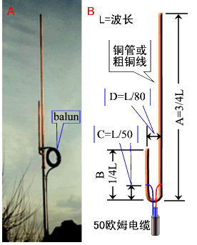 雙線J極子天線有容易制作、便于攜帶、便于隱藏等特點(diǎn)。以下詳細(xì)介紹其制作步驟:計(jì)算真空波長(zhǎng):L=300/f 米,其中f是發(fā)射頻率(兆赫) 計(jì)算長(zhǎng)度A、B、C:A=0.5*0.94*L,B=0.25