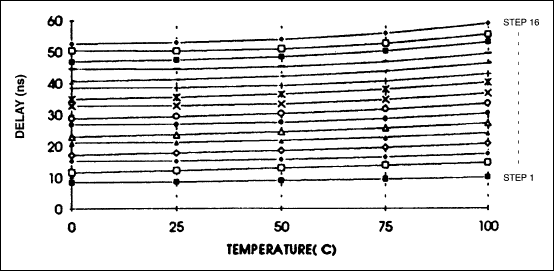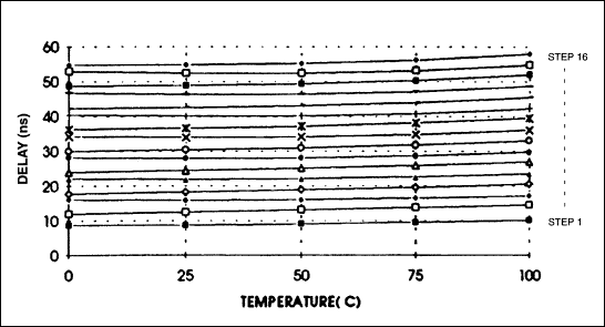 The DS1045 is a voltage compensated device whose outputs, both rising and falling edges, vary less than 300 picoseconds with voltage excursions from 4.75 to 5.25 volts. Figure 6 indicates the values for each of the 16 delay steps.