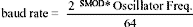 As mentioned, the illustrated mode of generating a baud rate does not involve a timer (i.e., serial mode 2). The baud rate is selectable as shown in the following equation: