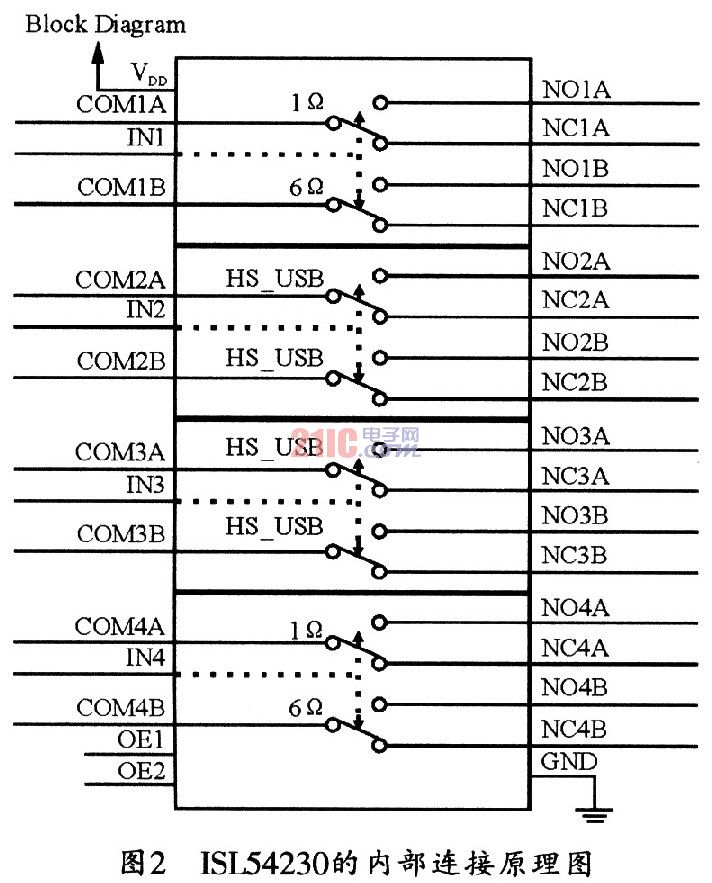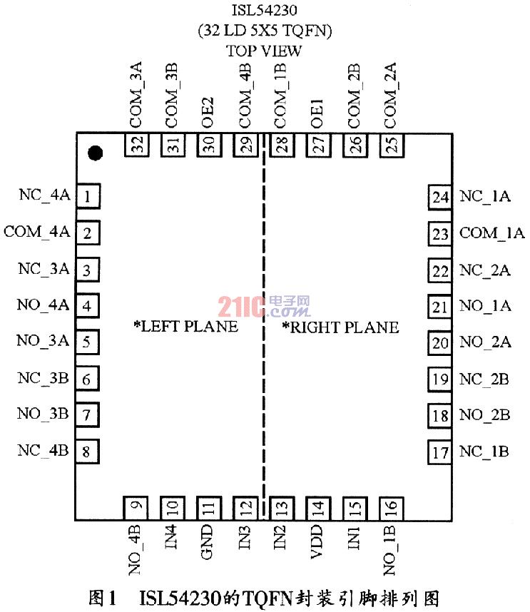 ??? ISL54230開(kāi)關(guān)芯片采用TQFN小型封裝,圖1所示是其引腳排列圖。圖2為其內(nèi)部連接功能圖。芯片各引腳的功能如下: