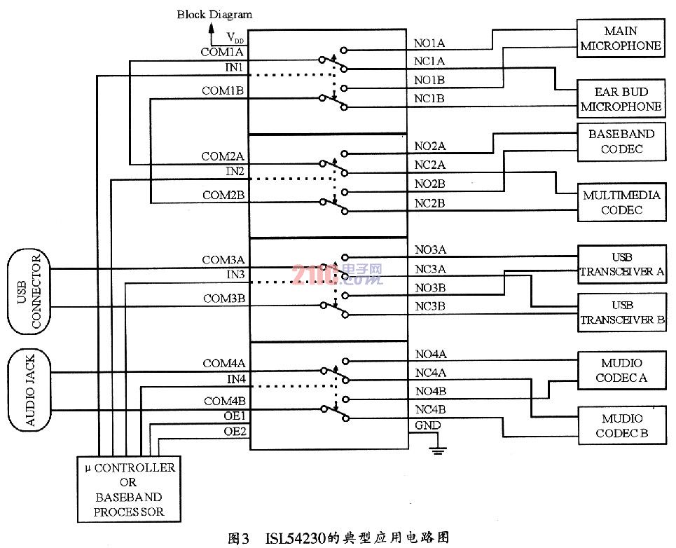 ??? ISL54230是一個(gè)多協(xié)議交換機(jī),它包含8個(gè)開(kāi)關(guān),可配置成四個(gè)雙刀雙擲開(kāi)關(guān)。它的每一個(gè)雙刀雙擲開(kāi)關(guān)都可由一個(gè)獨(dú)立邏輯引腳來(lái)控制。ISL54230有四個(gè)開(kāi)關(guān),可通過(guò)USB2.0接口方式傳遞模擬或數(shù)字音頻信號(hào)。FSL54230有36球柵WLCSP封裝和32引腳TQFN封裝,可用于手機(jī)和PDA等小尺寸應(yīng)用。圖3所示是:ISL54230的典型應(yīng)用電路。