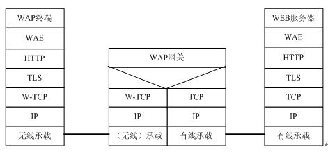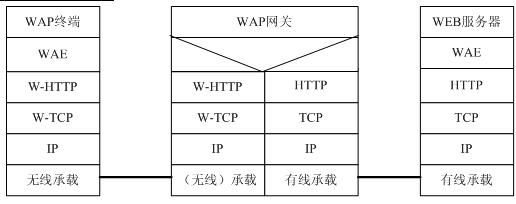 上圖中WAP網(wǎng)關(guān)作為HTTP代理;WAP網(wǎng)關(guān)也可以作為業(yè)務(wù)安全承載代理或直接訪問(wèn)中轉(zhuǎn)點(diǎn),協(xié)議棧如下: