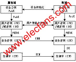 密鑰體系的最上面兩層是設備公私鑰對和用戶密鑰。對于諸如機頂盒的終端設備,在初始化時生成公私鑰對,私鑰在終端安全存儲,公鑰通過安全通道送到前端CA中心申請終端證書,這樣服務端就維護著終端的設備公鑰或證書。在為用戶分發(fā)智能卡時需要初始化智能卡,并在智能卡內(nèi)寫入用戶密鑰或域密鑰,并且服務端也維護用戶密鑰/域密鑰和智能卡的對應關(guān)系。