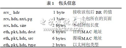 網(wǎng)卡芯片接收到以太網(wǎng)數(shù)據(jù)包后,存在CURR指向的頁面中。一個數(shù)據(jù)包可以占據(jù)一頁,也可以占據(jù)多頁。在接收包的包頭里,保存有該包的信息。包頭格式如表1: