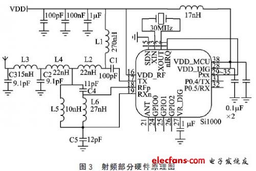 公司生產(chǎn)的Si1000芯片,Si1000器件是完全集成的低功耗混合信號片上系統(tǒng)型MCU,它集成了8051單片機內(nèi)核和射頻芯片為一體,具有4 k的片內(nèi)RAM和64 k的FLASH。Si1000芯片集上