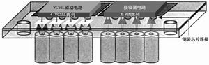 圖3給出了一個采用UTSi CMOS工藝制造的10 Gbps雙向(發(fā)送和接收)并行光學模塊。通過以倒裝片方式將垂直腔面發(fā)射激光器(VCSEL)以及PIN光電檢測二極管連接到驅(qū)動電路(激光驅(qū)動電路和TIA/LA)上,幾乎可以解決所有與鍵合寄生參量以及對準相關的問題。在藍寶石襯底上利用激光切割出對齊定位孔來提供機械自對準功能,從而可保證可靠的光學耦合。